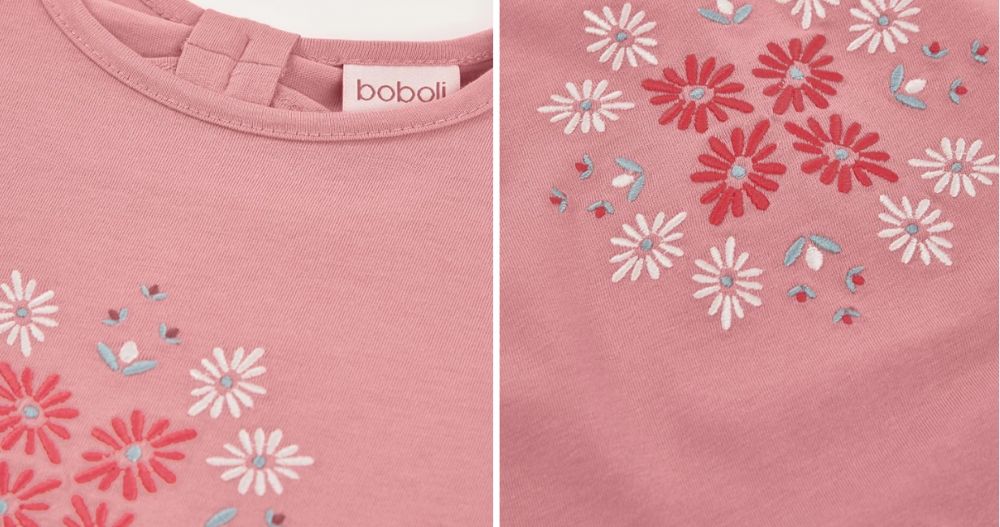 Maglietta in maglia di cotone per bambina, di colore rosa, ideale per tutti i giorni. Con ricamo floreale in vari colori. Presenta un design a maniche corte con volant, e schiena con dettaglio scoperto, si adatta alla crescita delle più piccole. È un capo comodo e leggero che può essere abbinato a jeans o gonne per creare uno stile casual e affascinante.