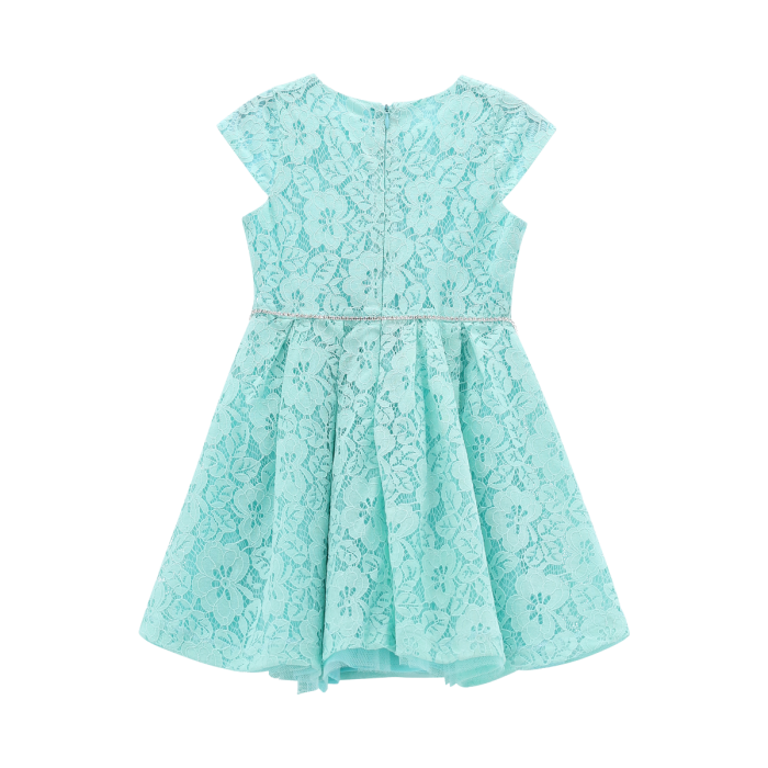 Abito girocollo a maniche corte per ragazza, realizzato in pizzo e doppiato in tulle tinta unita. Molto vezzose la gonna a pieghe e la cintura luccicante. Perfetto per le cerimonie in primavera!